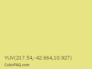 YUV 217.54,-42.664,10.927 Color is a light yellow color and the nearest color is Flax #eedc82. Hex code #e6e483 and RGB value is rgb(230,228,131). In RGB color space, this color is composed of 90% red, 89% green, 51% blue, In CMYK color space, this color is composed of 0% cyan, 1% magenta, 43% yellow , 10% black , In HSL color space, this color has a hue angle of 59° , 66% saturation and 71% lightness.