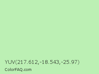 YUV 217.612,-18.543,-25.97 Color is a very light green color and the nearest color is Madang #b7f0be. Hex code #bcf0b4 and RGB value is rgb(188,240,180). In RGB color space, this color is composed of 74% red, 94% green, 71% blue, In CMYK color space, this color is composed of 22% cyan, 0% magenta, 25% yellow , 6% black , In HSL color space, this color has a hue angle of 112° , 67% saturation and 82% lightness.