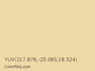 YUV 217.878,-25.083,18.524 Color is a light orange color and the nearest color is Maize #f5d5a0. Hex code #efd9a7 and RGB value is rgb(239,217,167). In RGB color space, this color is composed of 94% red, 85% green, 65% blue, In CMYK color space, this color is composed of 0% cyan, 9% magenta, 30% yellow , 6% black , In HSL color space, this color has a hue angle of 42° , 69% saturation and 80% lightness.