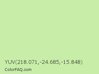 YUV 218.071,-24.685,-15.848 Color is a light green color and the nearest color is Gossip #d2f8b0. Hex code #c8eda8 and RGB value is rgb(200,237,168). In RGB color space, this color is composed of 78% red, 93% green, 66% blue, In CMYK color space, this color is composed of 16% cyan, 0% magenta, 29% yellow , 7% black , In HSL color space, this color has a hue angle of 92° , 66% saturation and 79% lightness.