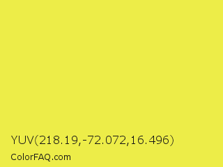 YUV 218.19,-72.072,16.496 Color is a light yellow color and the nearest color is Starship #ecf245. Hex code #eded48 and RGB value is rgb(237,237,72). In RGB color space, this color is composed of 93% red, 93% green, 28% blue, In CMYK color space, this color is composed of 0% cyan, 0% magenta, 70% yellow , 7% black , In HSL color space, this color has a hue angle of 60° , 82% saturation and 61% lightness.