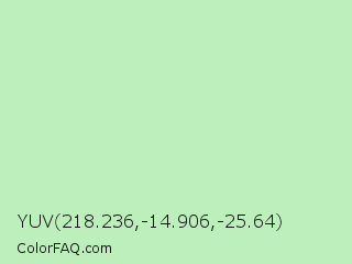 YUV 218.236,-14.906,-25.64 Color is a very light green color and the nearest color is Madang #b7f0be. Hex code #bdefbc and RGB value is rgb(189,239,188). In RGB color space, this color is composed of 74% red, 94% green, 74% blue, In CMYK color space, this color is composed of 21% cyan, 0% magenta, 21% yellow , 6% black , In HSL color space, this color has a hue angle of 119° , 61% saturation and 84% lightness.