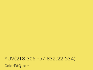 YUV 218.306,-57.832,22.534 Color is a light yellow color and the nearest color is Portica #f9e663. Hex code #f4e465 and RGB value is rgb(244,228,101). In RGB color space, this color is composed of 96% red, 89% green, 40% blue, In CMYK color space, this color is composed of 0% cyan, 7% magenta, 59% yellow , 4% black , In HSL color space, this color has a hue angle of 53° , 87% saturation and 68% lightness.
