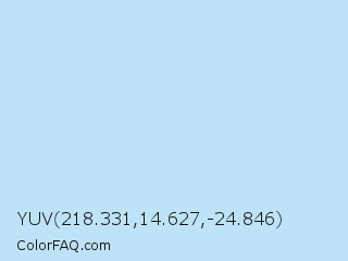 YUV 218.331,14.627,-24.846 Color is a very light blue color and the nearest color is Sail #b8e0f9. Hex code #bee3f8 and RGB value is rgb(190,227,248). In RGB color space, this color is composed of 75% red, 89% green, 97% blue, In CMYK color space, this color is composed of 23% cyan, 8% magenta, 0% yellow , 3% black , In HSL color space, this color has a hue angle of 202° , 81% saturation and 86% lightness.
