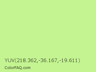 YUV 218.362,-36.167,-19.611 Color is a light green color and the nearest color is Reef #c9ffa2. Hex code #c4f491 and RGB value is rgb(196,244,145). In RGB color space, this color is composed of 77% red, 96% green, 57% blue, In CMYK color space, this color is composed of 20% cyan, 0% magenta, 41% yellow , 4% black , In HSL color space, this color has a hue angle of 89° , 82% saturation and 76% lightness.