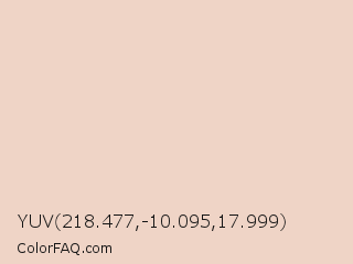 YUV 218.477,-10.095,17.999 Color is a very light orange color and the nearest color is Almond #eed9c4. Hex code #efd4c6 and RGB value is rgb(239,212,198). In RGB color space, this color is composed of 94% red, 83% green, 78% blue, In CMYK color space, this color is composed of 0% cyan, 11% magenta, 17% yellow , 6% black , In HSL color space, this color has a hue angle of 20° , 56% saturation and 86% lightness.