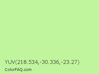 YUV 218.534,-30.336,-23.27 Color is a light green color and the nearest color is Reef #c9ffa2. Hex code #c0f49d and RGB value is rgb(192,244,157). In RGB color space, this color is composed of 75% red, 96% green, 62% blue, In CMYK color space, this color is composed of 21% cyan, 0% magenta, 36% yellow , 4% black , In HSL color space, this color has a hue angle of 96° , 80% saturation and 79% lightness.