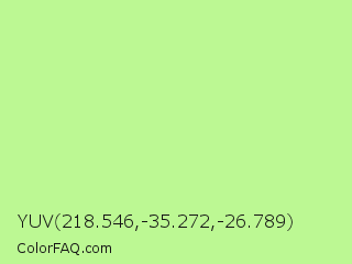 YUV 218.546,-35.272,-26.789 Color is a light green color and the nearest color is Reef #c9ffa2. Hex code #bcf893 and RGB value is rgb(188,248,147). In RGB color space, this color is composed of 74% red, 97% green, 58% blue, In CMYK color space, this color is composed of 24% cyan, 0% magenta, 41% yellow , 3% black , In HSL color space, this color has a hue angle of 96° , 88% saturation and 77% lightness.