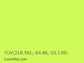 YUV 218.561,-64.86,-10.139 Color is a light lime color and the nearest color is Maximum Green Yellow #d9e650. Hex code #cffa57 and RGB value is rgb(207,250,87). In RGB color space, this color is composed of 81% red, 98% green, 34% blue, In CMYK color space, this color is composed of 17% cyan, 0% magenta, 65% yellow , 2% black , In HSL color space, this color has a hue angle of 76° , 94% saturation and 66% lightness.