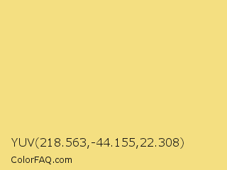 YUV 218.563,-44.155,22.308 Color is a light yellow color and the nearest color is Buff #f0dc82. Hex code #f4df81 and RGB value is rgb(244,223,129). In RGB color space, this color is composed of 96% red, 87% green, 51% blue, In CMYK color space, this color is composed of 0% cyan, 9% magenta, 47% yellow , 4% black , In HSL color space, this color has a hue angle of 49° , 84% saturation and 73% lightness.