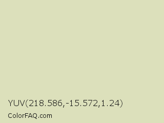 YUV 218.586,-15.572,1.24 Color is a very light yellow color and the nearest color is Beryl Green #dee5c0. Hex code #dce0bb and RGB value is rgb(220,224,187). In RGB color space, this color is composed of 86% red, 88% green, 73% blue, In CMYK color space, this color is composed of 2% cyan, 0% magenta, 17% yellow , 12% black , In HSL color space, this color has a hue angle of 66° , 37% saturation and 81% lightness.