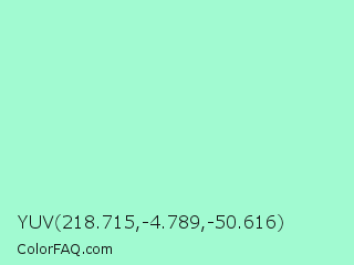 YUV 218.715,-4.789,-50.616 Color is a very light green color and the nearest color is Magic Mint #aaf0d1. Hex code #a1fad1 and RGB value is rgb(161,250,209). In RGB color space, this color is composed of 63% red, 98% green, 82% blue, In CMYK color space, this color is composed of 36% cyan, 0% magenta, 16% yellow , 2% black , In HSL color space, this color has a hue angle of 152° , 90% saturation and 81% lightness.