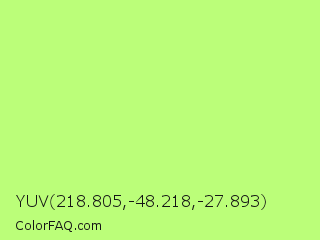 YUV 218.805,-48.218,-27.893 Color is a light green color and the nearest color is Sulu #c1f07c. Hex code #bbfe79 and RGB value is rgb(187,254,121). In RGB color space, this color is composed of 73% red, 100% green, 47% blue, In CMYK color space, this color is composed of 26% cyan, 0% magenta, 52% yellow , 0% black , In HSL color space, this color has a hue angle of 90° , 99% saturation and 74% lightness.