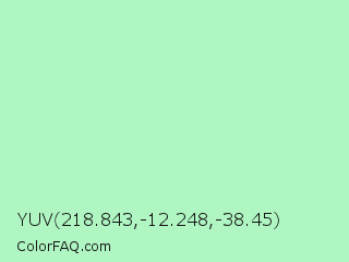 YUV 218.843,-12.248,-38.45 Color is a very light green color and the nearest color is Madang #b7f0be. Hex code #aff6c2 and RGB value is rgb(175,246,194). In RGB color space, this color is composed of 69% red, 96% green, 76% blue, In CMYK color space, this color is composed of 29% cyan, 0% magenta, 21% yellow , 4% black , In HSL color space, this color has a hue angle of 136° , 80% saturation and 83% lightness.