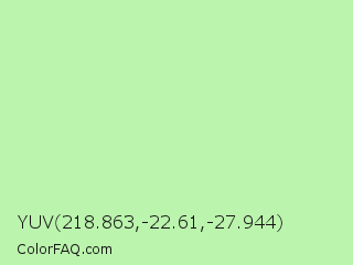 YUV 218.863,-22.61,-27.944 Color is a very light green color and the nearest color is Madang #b7f0be. Hex code #bbf4ad and RGB value is rgb(187,244,173). In RGB color space, this color is composed of 73% red, 96% green, 68% blue, In CMYK color space, this color is composed of 23% cyan, 0% magenta, 29% yellow , 4% black , In HSL color space, this color has a hue angle of 108° , 76% saturation and 82% lightness.