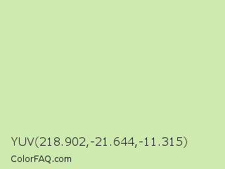 YUV 218.902,-21.644,-11.315 Color is a light green color and the nearest color is Gossip #d2f8b0. Hex code #ceeaaf and RGB value is rgb(206,234,175). In RGB color space, this color is composed of 81% red, 92% green, 69% blue, In CMYK color space, this color is composed of 12% cyan, 0% magenta, 25% yellow , 8% black , In HSL color space, this color has a hue angle of 88° , 58% saturation and 80% lightness.