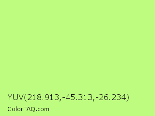 YUV 218.913,-45.313,-26.234 Color is a light green color and the nearest color is Sulu #c1f07c. Hex code #bdfc7f and RGB value is rgb(189,252,127). In RGB color space, this color is composed of 74% red, 99% green, 50% blue, In CMYK color space, this color is composed of 25% cyan, 0% magenta, 50% yellow , 1% black , In HSL color space, this color has a hue angle of 90° , 95% saturation and 74% lightness.