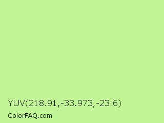 YUV 218.91,-33.973,-23.6 Color is a light green color and the nearest color is Reef #c9ffa2. Hex code #c0f696 and RGB value is rgb(192,246,150). In RGB color space, this color is composed of 75% red, 96% green, 59% blue, In CMYK color space, this color is composed of 22% cyan, 0% magenta, 39% yellow , 4% black , In HSL color space, this color has a hue angle of 94° , 84% saturation and 78% lightness.