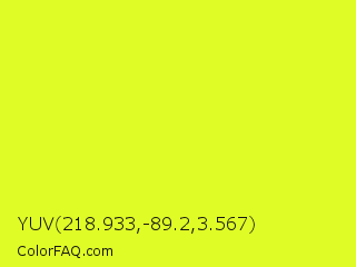 YUV 218.933,-89.2,3.567 Color is a normal yellow color and the nearest color is Arctic Lime #d0ff14. Hex code #dffc26 and RGB value is rgb(223,252,38). In RGB color space, this color is composed of 87% red, 99% green, 15% blue, In CMYK color space, this color is composed of 12% cyan, 0% magenta, 85% yellow , 1% black , In HSL color space, this color has a hue angle of 68° , 97% saturation and 57% lightness.
