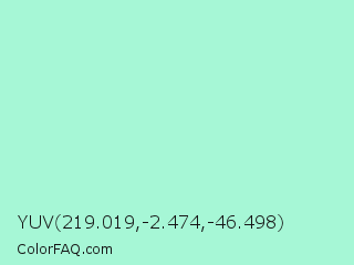 YUV 219.019,-2.474,-46.498 Color is a very light green color and the nearest color is Magic Mint #aaf0d1. Hex code #a6f7d6 and RGB value is rgb(166,247,214). In RGB color space, this color is composed of 65% red, 97% green, 84% blue, In CMYK color space, this color is composed of 33% cyan, 0% magenta, 13% yellow , 3% black , In HSL color space, this color has a hue angle of 156° , 84% saturation and 81% lightness.
