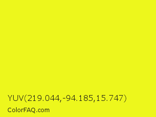 YUV 219.044,-94.185,15.747 Color is a normal yellow color and the nearest color is Broom #ffec13. Hex code #edf71c and RGB value is rgb(237,247,28). In RGB color space, this color is composed of 93% red, 97% green, 11% blue, In CMYK color space, this color is composed of 4% cyan, 0% magenta, 89% yellow , 3% black , In HSL color space, this color has a hue angle of 63° , 93% saturation and 54% lightness.