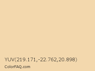 YUV 219.171,-22.762,20.898 Color is a very light orange color and the nearest color is Chamois #eddcb1. Hex code #f3d8ad and RGB value is rgb(243,216,173). In RGB color space, this color is composed of 95% red, 85% green, 68% blue, In CMYK color space, this color is composed of 0% cyan, 11% magenta, 29% yellow , 5% black , In HSL color space, this color has a hue angle of 37° , 74% saturation and 82% lightness.