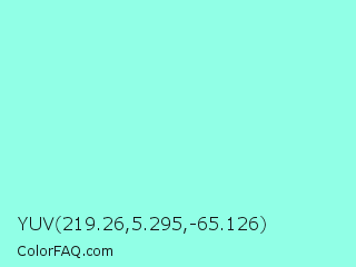 YUV 219.26,5.295,-65.126 Color is a light cyan color and the nearest color is Aquamarine #7fffd4. Hex code #91ffe6 and RGB value is rgb(145,255,230). In RGB color space, this color is composed of 57% red, 100% green, 90% blue, In CMYK color space, this color is composed of 43% cyan, 0% magenta, 10% yellow , 0% black , In HSL color space, this color has a hue angle of 166° , 100% saturation and 78% lightness.