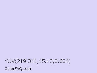 YUV 219.311,15.13,0.604 Color is a very light indigo color and the nearest color is Pale Lavender #dcd0ff. Hex code #dcd5fa and RGB value is rgb(220,213,250). In RGB color space, this color is composed of 86% red, 84% green, 98% blue, In CMYK color space, this color is composed of 12% cyan, 15% magenta, 0% yellow , 2% black , In HSL color space, this color has a hue angle of 251° , 79% saturation and 91% lightness.