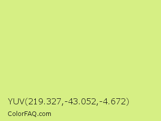 YUV 219.327,-43.052,-4.672 Color is a light lime color and the nearest color is Mindaro #e3f988. Hex code #d6ef84 and RGB value is rgb(214,239,132). In RGB color space, this color is composed of 84% red, 94% green, 52% blue, In CMYK color space, this color is composed of 10% cyan, 0% magenta, 45% yellow , 6% black , In HSL color space, this color has a hue angle of 74° , 77% saturation and 73% lightness.