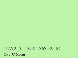 YUV 219.418,-24.363,-25.8 Color is a very light green color and the nearest color is Reef #c9ffa2. Hex code #bef4aa and RGB value is rgb(190,244,170). In RGB color space, this color is composed of 75% red, 96% green, 67% blue, In CMYK color space, this color is composed of 22% cyan, 0% magenta, 30% yellow , 4% black , In HSL color space, this color has a hue angle of 104° , 77% saturation and 81% lightness.