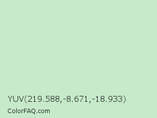 YUV 219.588,-8.671,-18.933 Color is a very light green color and the nearest color is Surf Crest #cfe5d2. Hex code #c6eaca and RGB value is rgb(198,234,202). In RGB color space, this color is composed of 78% red, 92% green, 79% blue, In CMYK color space, this color is composed of 15% cyan, 0% magenta, 14% yellow , 8% black , In HSL color space, this color has a hue angle of 127° , 46% saturation and 85% lightness.