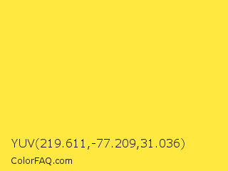 YUV 219.611,-77.209,31.036 Color is a light yellow color and the nearest color is Gargoyle Gas #ffdf46. Hex code #ffe83f and RGB value is rgb(255,232,63). In RGB color space, this color is composed of 100% red, 91% green, 25% blue, In CMYK color space, this color is composed of 0% cyan, 9% magenta, 75% yellow , 0% black , In HSL color space, this color has a hue angle of 53° , 100% saturation and 62% lightness.