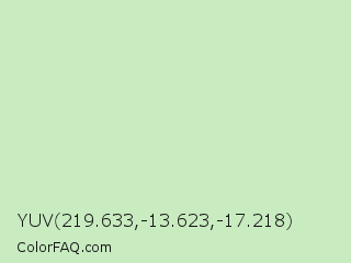 YUV 219.633,-13.623,-17.218 Color is a very light green color and the nearest color is Tea Green #d0f0c0. Hex code #c8ebc0 and RGB value is rgb(200,235,192). In RGB color space, this color is composed of 78% red, 92% green, 75% blue, In CMYK color space, this color is composed of 15% cyan, 0% magenta, 18% yellow , 8% black , In HSL color space, this color has a hue angle of 109° , 52% saturation and 84% lightness.