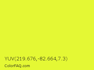 YUV 219.676,-82.664,7.3 Color is a normal yellow color and the nearest color is Golden Fizz #f5fb3d. Hex code #e4f834 and RGB value is rgb(228,248,52). In RGB color space, this color is composed of 89% red, 97% green, 20% blue, In CMYK color space, this color is composed of 8% cyan, 0% magenta, 79% yellow , 3% black , In HSL color space, this color has a hue angle of 66° , 93% saturation and 59% lightness.