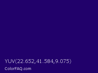 YUV 22.652,41.584,9.075 Color is a very dark indigo color and the nearest color is Paua #260368. Hex code #21016b and RGB value is rgb(33,1,107). In RGB color space, this color is composed of 13% red, 0% green, 42% blue, In CMYK color space, this color is composed of 69% cyan, 99% magenta, 0% yellow , 58% black , In HSL color space, this color has a hue angle of 258° , 98% saturation and 21% lightness.