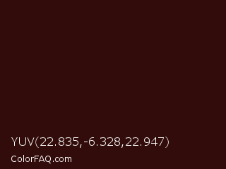 YUV 22.835,-6.328,22.947 Color is a very dark red color and the nearest color is Zinnwaldite Brown #2c1608. Hex code #310c0a and RGB value is rgb(49,12,10). In RGB color space, this color is composed of 19% red, 5% green, 4% blue, In CMYK color space, this color is composed of 0% cyan, 76% magenta, 80% yellow , 81% black , In HSL color space, this color has a hue angle of 3° , 66% saturation and 12% lightness.