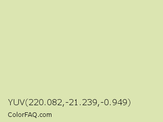 YUV 220.082,-21.239,-0.949 Color is a light lime color and the nearest color is Caper #dcedb4. Hex code #dbe5b1 and RGB value is rgb(219,229,177). In RGB color space, this color is composed of 86% red, 90% green, 69% blue, In CMYK color space, this color is composed of 4% cyan, 0% magenta, 23% yellow , 10% black , In HSL color space, this color has a hue angle of 72° , 50% saturation and 80% lightness.