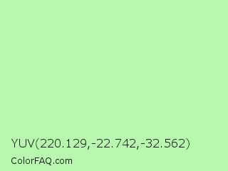 YUV 220.129,-22.742,-32.562 Color is a very light green color and the nearest color is Madang #b7f0be. Hex code #b7f8ae and RGB value is rgb(183,248,174). In RGB color space, this color is composed of 72% red, 97% green, 68% blue, In CMYK color space, this color is composed of 26% cyan, 0% magenta, 30% yellow , 3% black , In HSL color space, this color has a hue angle of 113° , 84% saturation and 83% lightness.