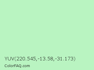 YUV 220.545,-13.58,-31.173 Color is a very light green color and the nearest color is Madang #b7f0be. Hex code #b9f4c1 and RGB value is rgb(185,244,193). In RGB color space, this color is composed of 73% red, 96% green, 76% blue, In CMYK color space, this color is composed of 24% cyan, 0% magenta, 21% yellow , 4% black , In HSL color space, this color has a hue angle of 128° , 73% saturation and 84% lightness.