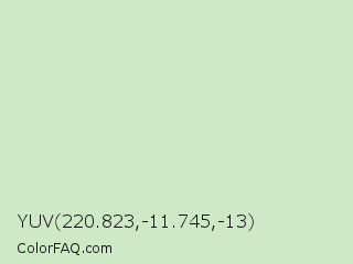 YUV 220.823,-11.745,-13 Color is a very light green color and the nearest color is Tea Green #d0f0c0. Hex code #cee9c5 and RGB value is rgb(206,233,197). In RGB color space, this color is composed of 81% red, 91% green, 77% blue, In CMYK color space, this color is composed of 12% cyan, 0% magenta, 15% yellow , 9% black , In HSL color space, this color has a hue angle of 105° , 45% saturation and 84% lightness.