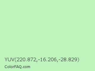 YUV 220.872,-16.206,-28.829 Color is a very light green color and the nearest color is Madang #b7f0be. Hex code #bcf4bc and RGB value is rgb(188,244,188). In RGB color space, this color is composed of 74% red, 96% green, 74% blue, In CMYK color space, this color is composed of 23% cyan, 0% magenta, 23% yellow , 4% black , In HSL color space, this color has a hue angle of 120° , 72% saturation and 85% lightness.