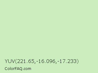 YUV 221.65,-16.096,-17.233 Color is a very light green color and the nearest color is Tea Green #d0f0c0. Hex code #caeebd and RGB value is rgb(202,238,189). In RGB color space, this color is composed of 79% red, 93% green, 74% blue, In CMYK color space, this color is composed of 15% cyan, 0% magenta, 21% yellow , 7% black , In HSL color space, this color has a hue angle of 104° , 59% saturation and 84% lightness.