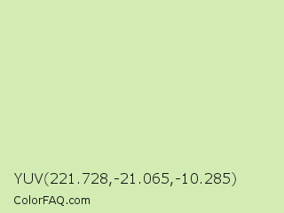 YUV 221.728,-21.065,-10.285 Color is a very light green color and the nearest color is Caper #dcedb4. Hex code #d2ecb3 and RGB value is rgb(210,236,179). In RGB color space, this color is composed of 82% red, 93% green, 70% blue, In CMYK color space, this color is composed of 11% cyan, 0% magenta, 24% yellow , 7% black , In HSL color space, this color has a hue angle of 87° , 60% saturation and 81% lightness.