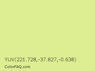 YUV 221.728,-37.827,-0.638 Color is a light yellow color and the nearest color is Key Lime #e8f48c. Hex code #dded91 and RGB value is rgb(221,237,145). In RGB color space, this color is composed of 87% red, 93% green, 57% blue, In CMYK color space, this color is composed of 7% cyan, 0% magenta, 39% yellow , 7% black , In HSL color space, this color has a hue angle of 70° , 72% saturation and 75% lightness.