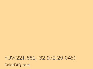 YUV 221.881,-32.972,29.045 Color is a light orange color and the nearest color is Cherokee #fcda98. Hex code #ffda9b and RGB value is rgb(255,218,155). In RGB color space, this color is composed of 100% red, 85% green, 61% blue, In CMYK color space, this color is composed of 0% cyan, 15% magenta, 39% yellow , 0% black , In HSL color space, this color has a hue angle of 38° , 100% saturation and 80% lightness.