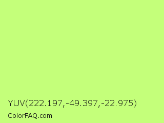 YUV 222.197,-49.397,-22.975 Color is a light green color and the nearest color is Sulu #c1f07c. Hex code #c4ff7a and RGB value is rgb(196,255,122). In RGB color space, this color is composed of 77% red, 100% green, 48% blue, In CMYK color space, this color is composed of 23% cyan, 0% magenta, 52% yellow , 0% black , In HSL color space, this color has a hue angle of 87° , 100% saturation and 74% lightness.