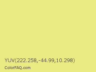 YUV 222.258,-44.99,10.298 Color is a light yellow color and the nearest color is Sahara Sand #f1e788. Hex code #eaea83 and RGB value is rgb(234,234,131). In RGB color space, this color is composed of 92% red, 92% green, 51% blue, In CMYK color space, this color is composed of 0% cyan, 0% magenta, 44% yellow , 8% black , In HSL color space, this color has a hue angle of 60° , 71% saturation and 72% lightness.