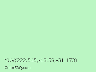 YUV 222.545,-13.58,-31.173 Color is a very light green color and the nearest color is Madang #b7f0be. Hex code #bbf6c3 and RGB value is rgb(187,246,195). In RGB color space, this color is composed of 73% red, 96% green, 76% blue, In CMYK color space, this color is composed of 24% cyan, 0% magenta, 21% yellow , 4% black , In HSL color space, this color has a hue angle of 128° , 77% saturation and 85% lightness.