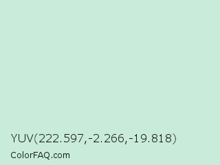 YUV 222.597,-2.266,-19.818 Color is a very light green color and the nearest color is Skeptic #cae6da. Hex code #c8ebda and RGB value is rgb(200,235,218). In RGB color space, this color is composed of 78% red, 92% green, 85% blue, In CMYK color space, this color is composed of 15% cyan, 0% magenta, 7% yellow , 8% black , In HSL color space, this color has a hue angle of 151° , 47% saturation and 85% lightness.