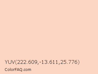 YUV 222.609,-13.611,25.776 Color is a very light orange color and the nearest color is Unbleached Silk #ffddca. Hex code #fcd5c3 and RGB value is rgb(252,213,195). In RGB color space, this color is composed of 99% red, 84% green, 76% blue, In CMYK color space, this color is composed of 0% cyan, 15% magenta, 23% yellow , 1% black , In HSL color space, this color has a hue angle of 19° , 90% saturation and 88% lightness.